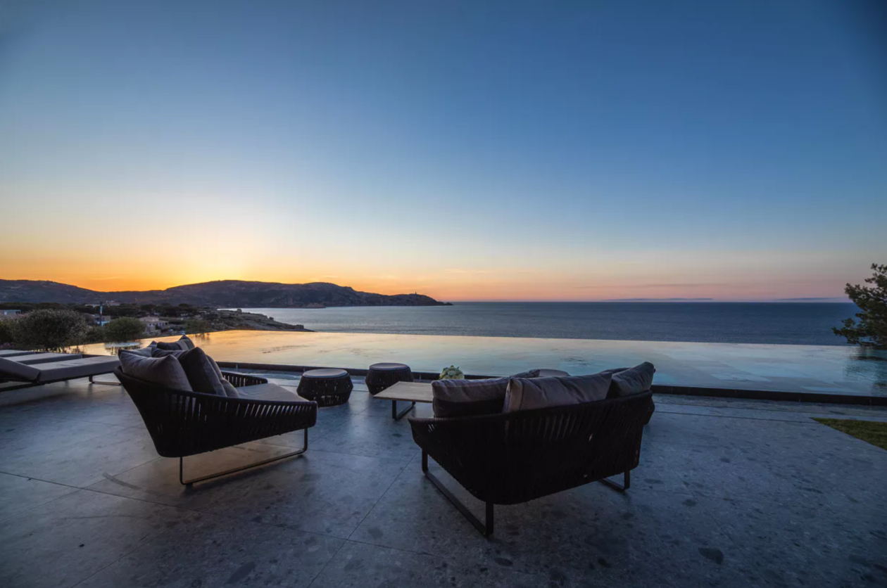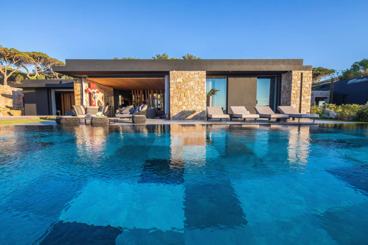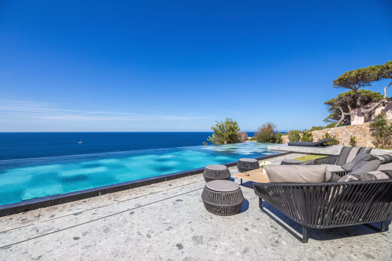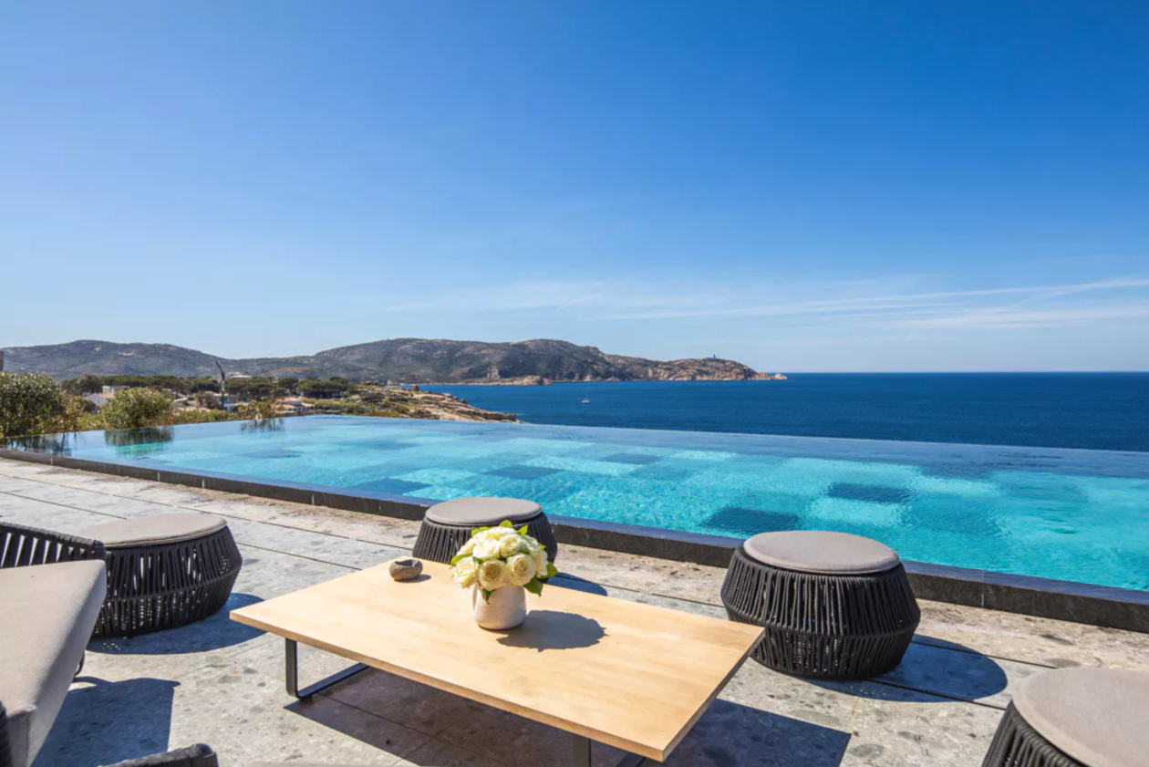 Construction contemporaine d'une piscine miroir à débordement en Corse de 24 m x 6 m , piscine carrelée