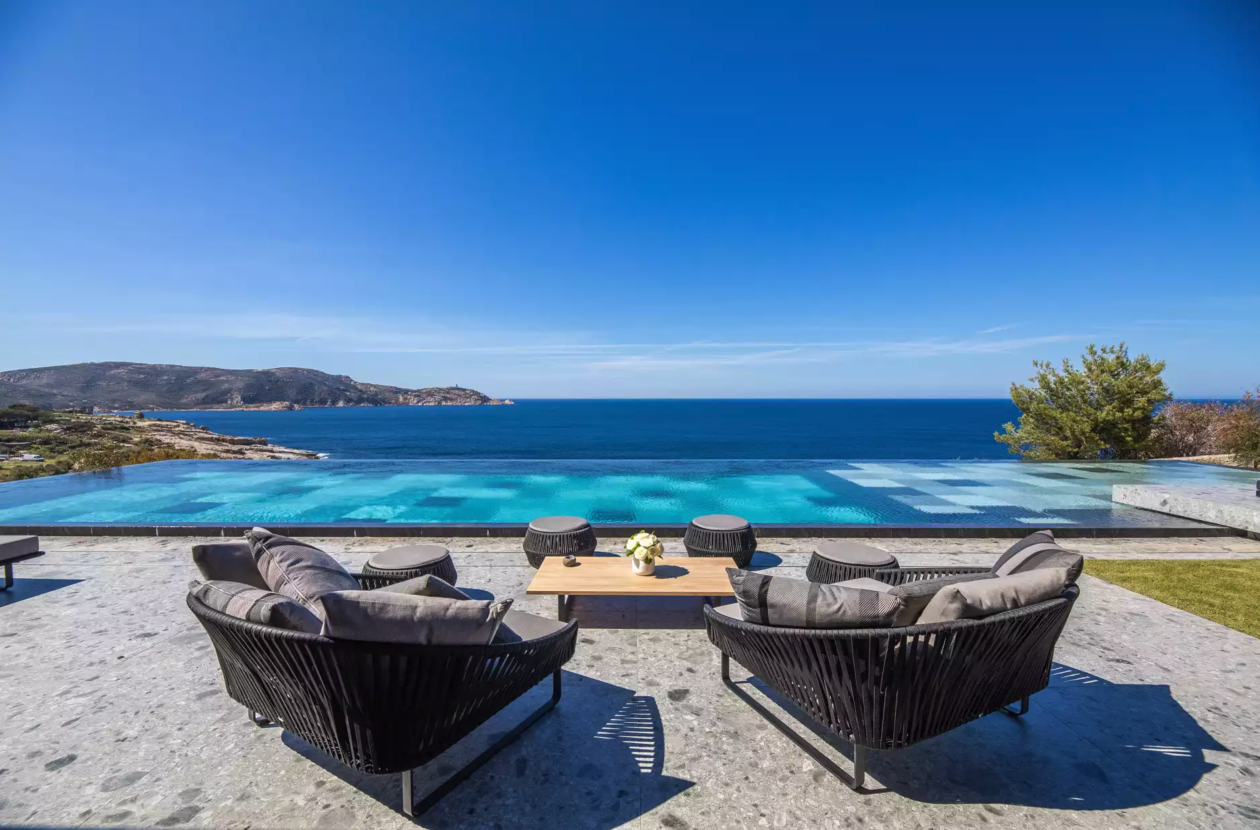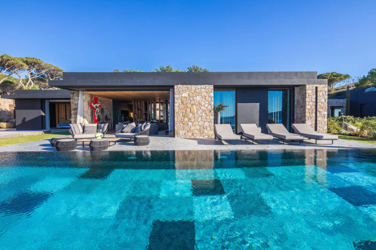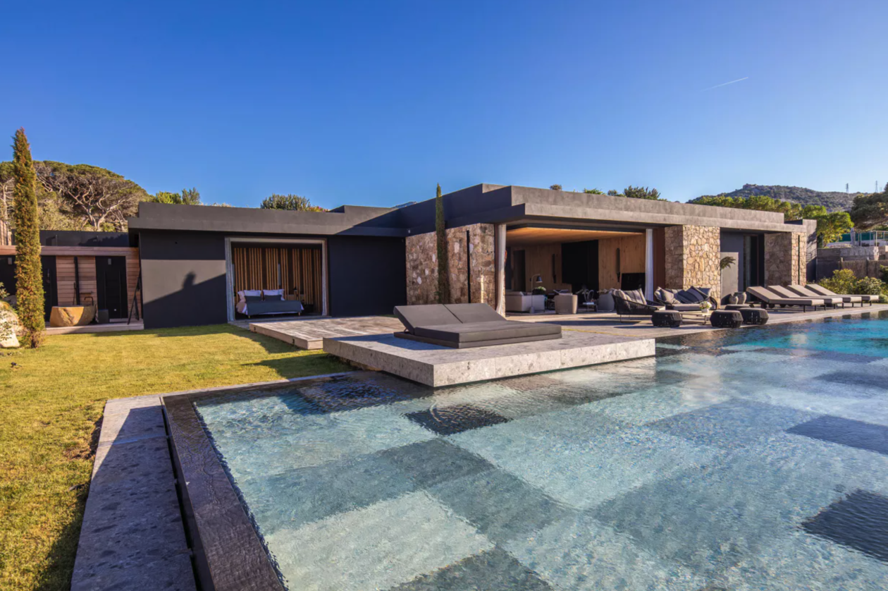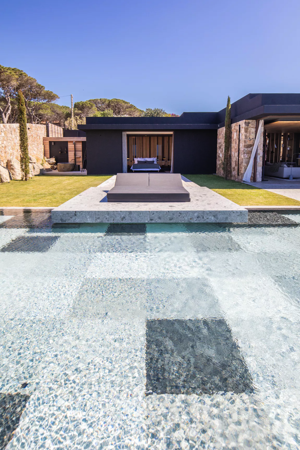 Construction contemporaine d'une piscine miroir à débordement en Corse de 24 m x 6 m , piscine carrelée