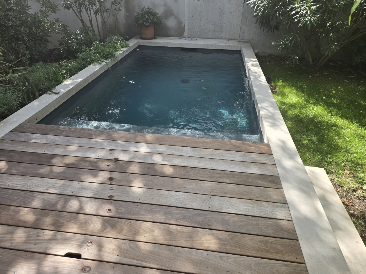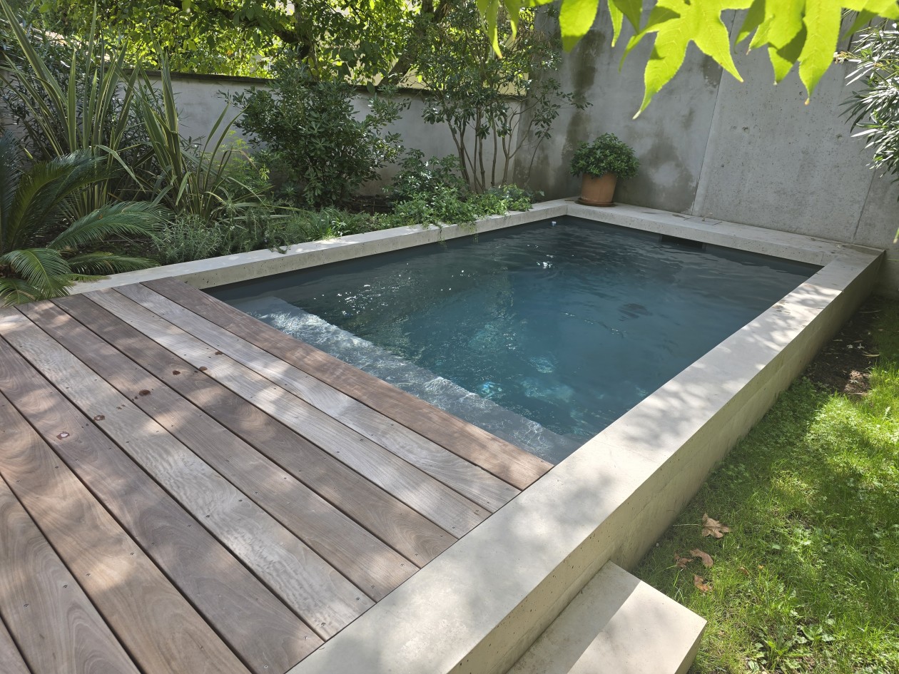 Micro Piscine 4m x 2m en plein centre de Lyon, avec une margelle réalisée en béton sur place.