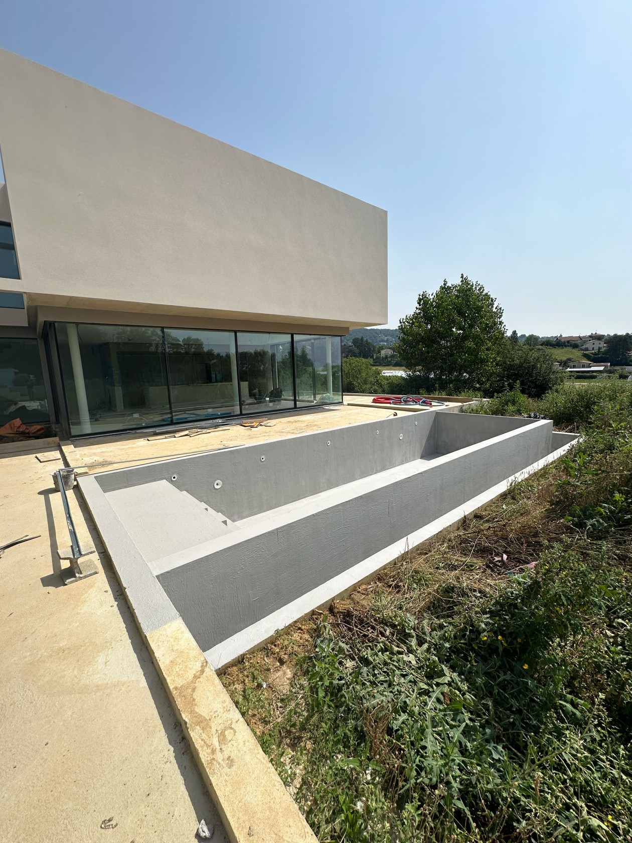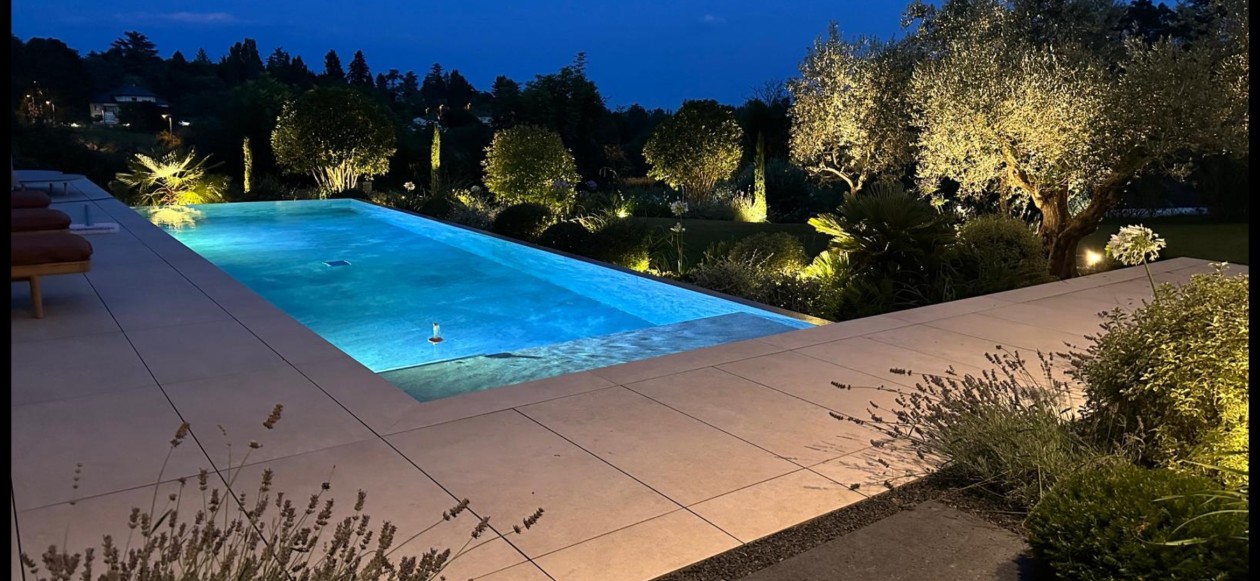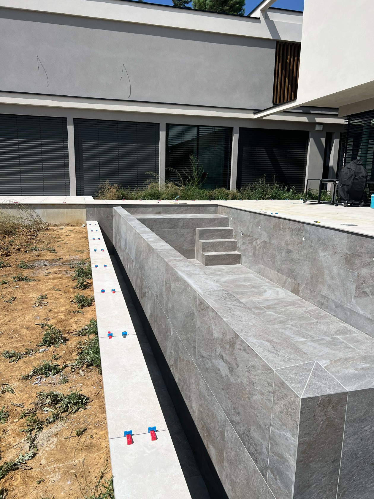 Piscine en béton armé à débordement, 11m x 3m, réalisée en carrelage Atlas Concorde.