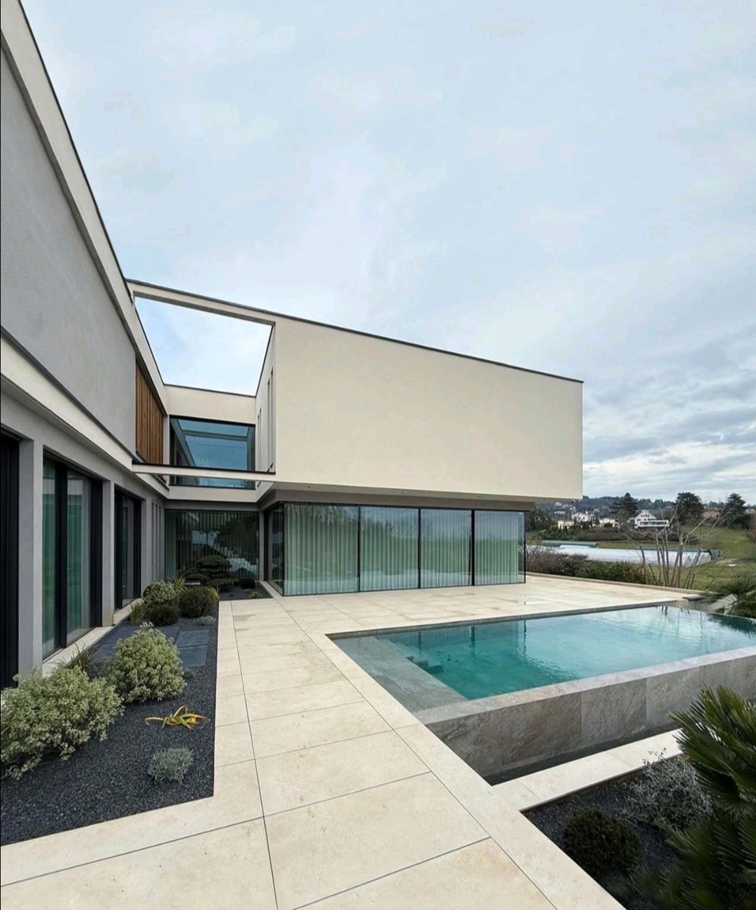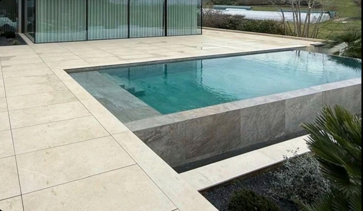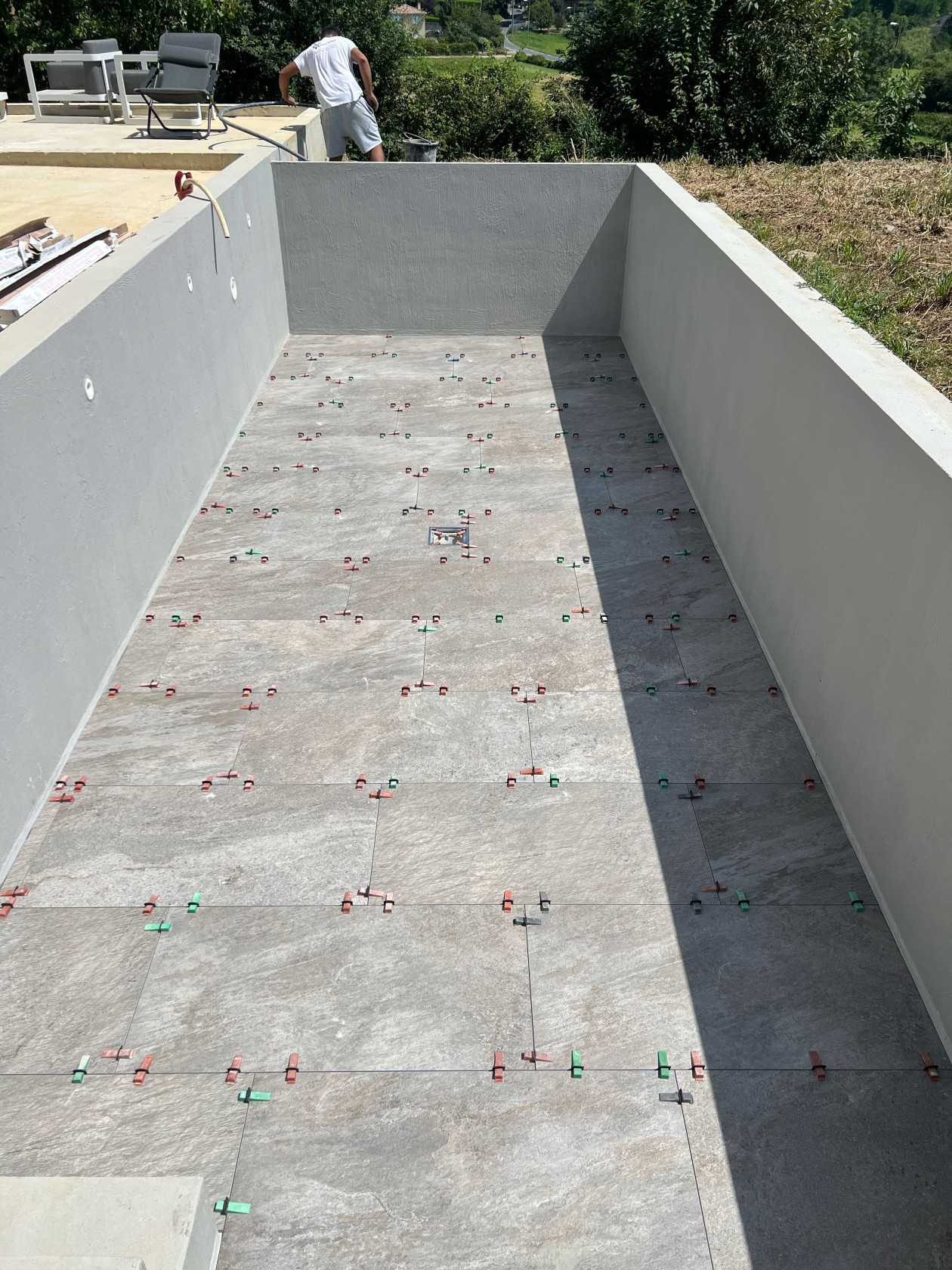 Piscine en béton armé à débordement, 11m x 3m, réalisée en carrelage Atlas Concorde.