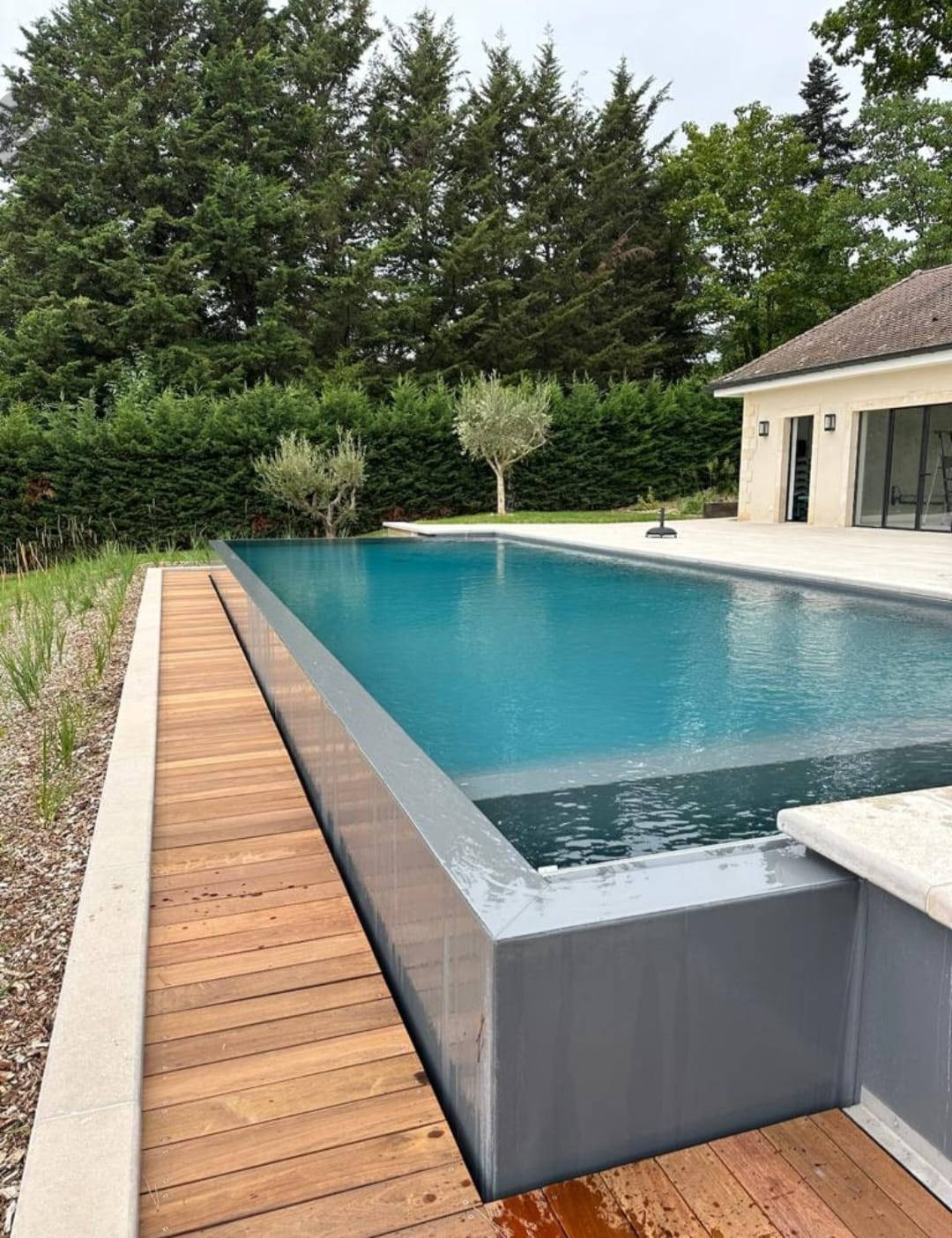 Piscine à débordement 16 m x 5 m dans les Monts d'or, bac du débordement protégé par des caillebotis pour plus de sécurité