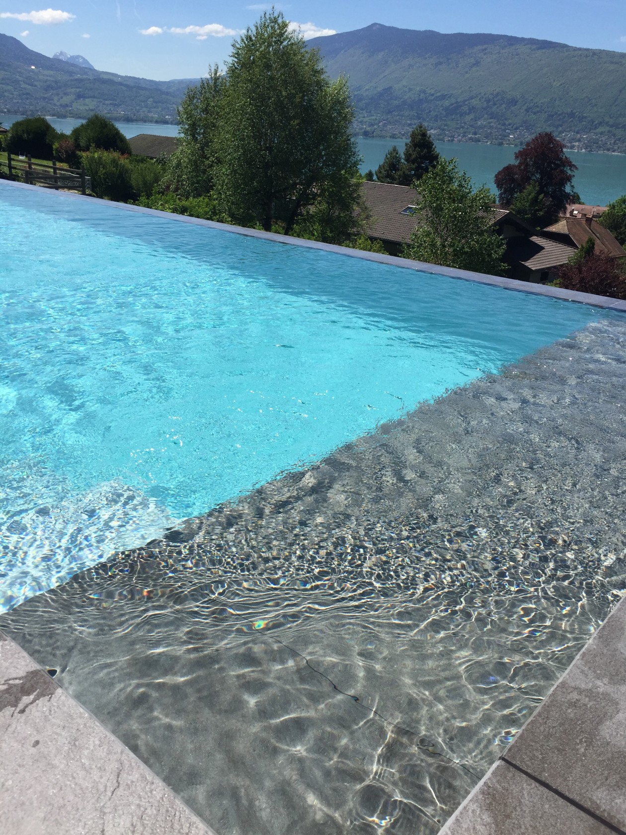 Piscine à débordement sur le lac d’Annecy, avec volet immergé.