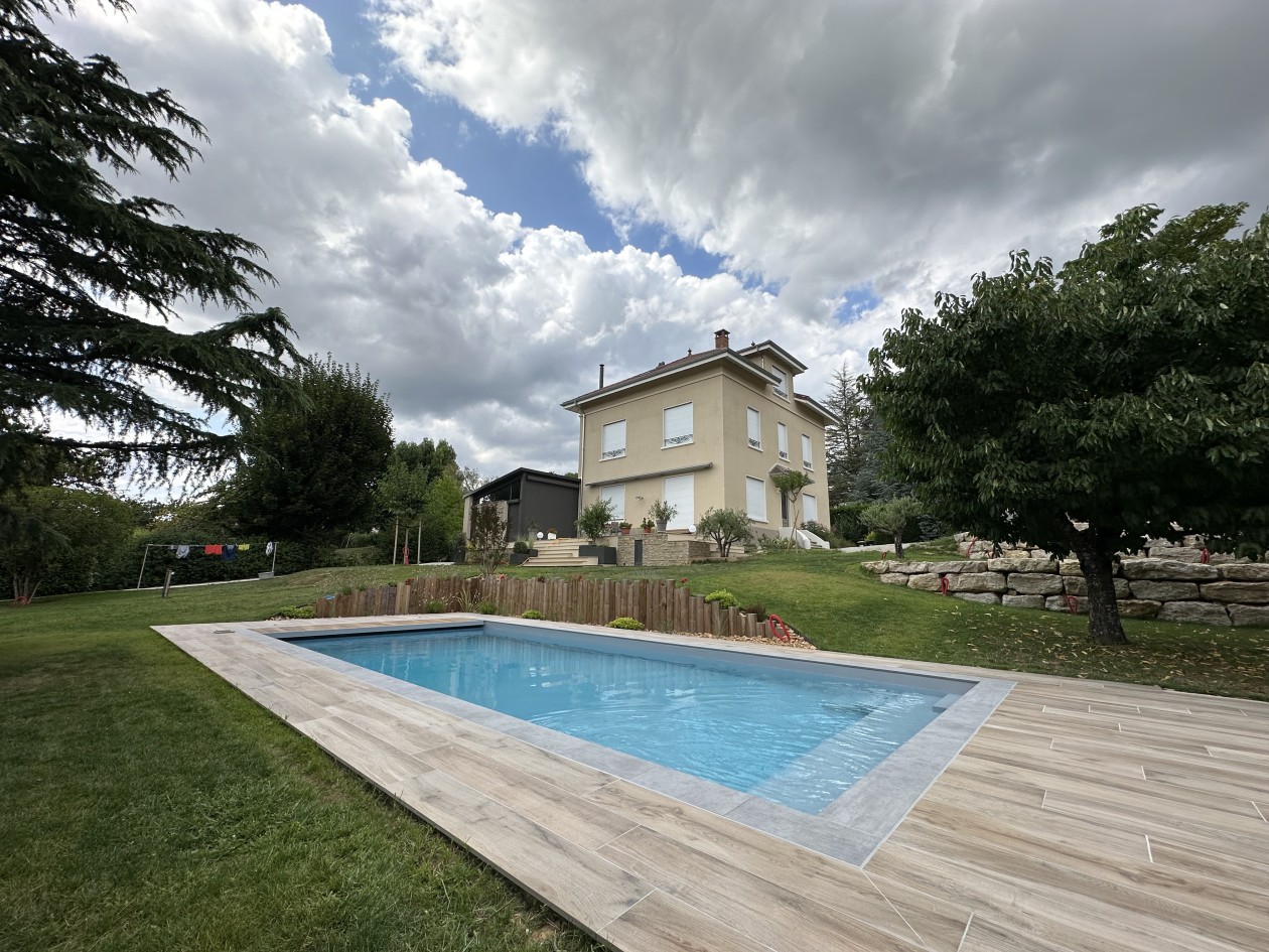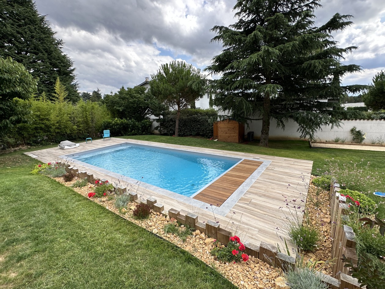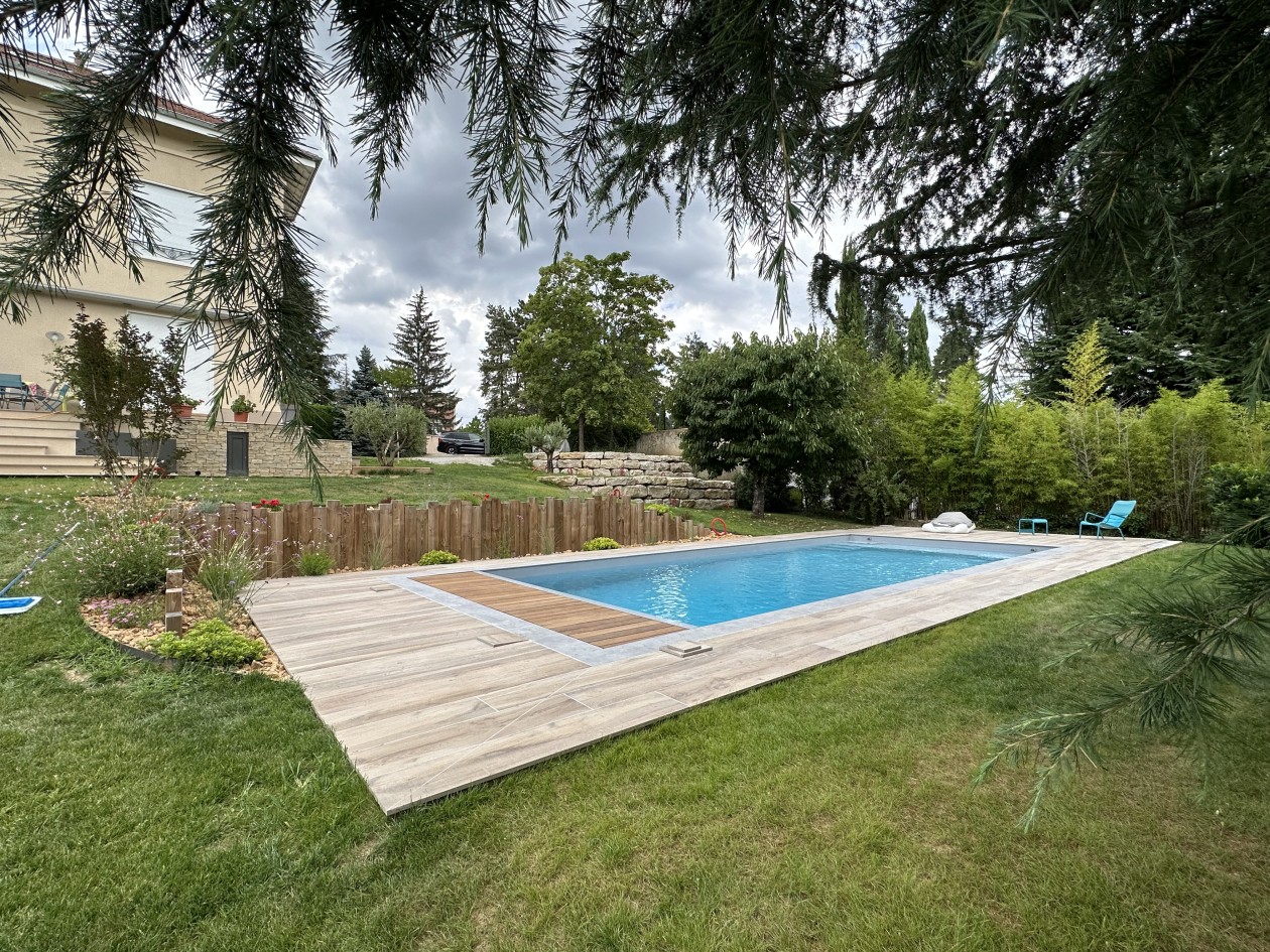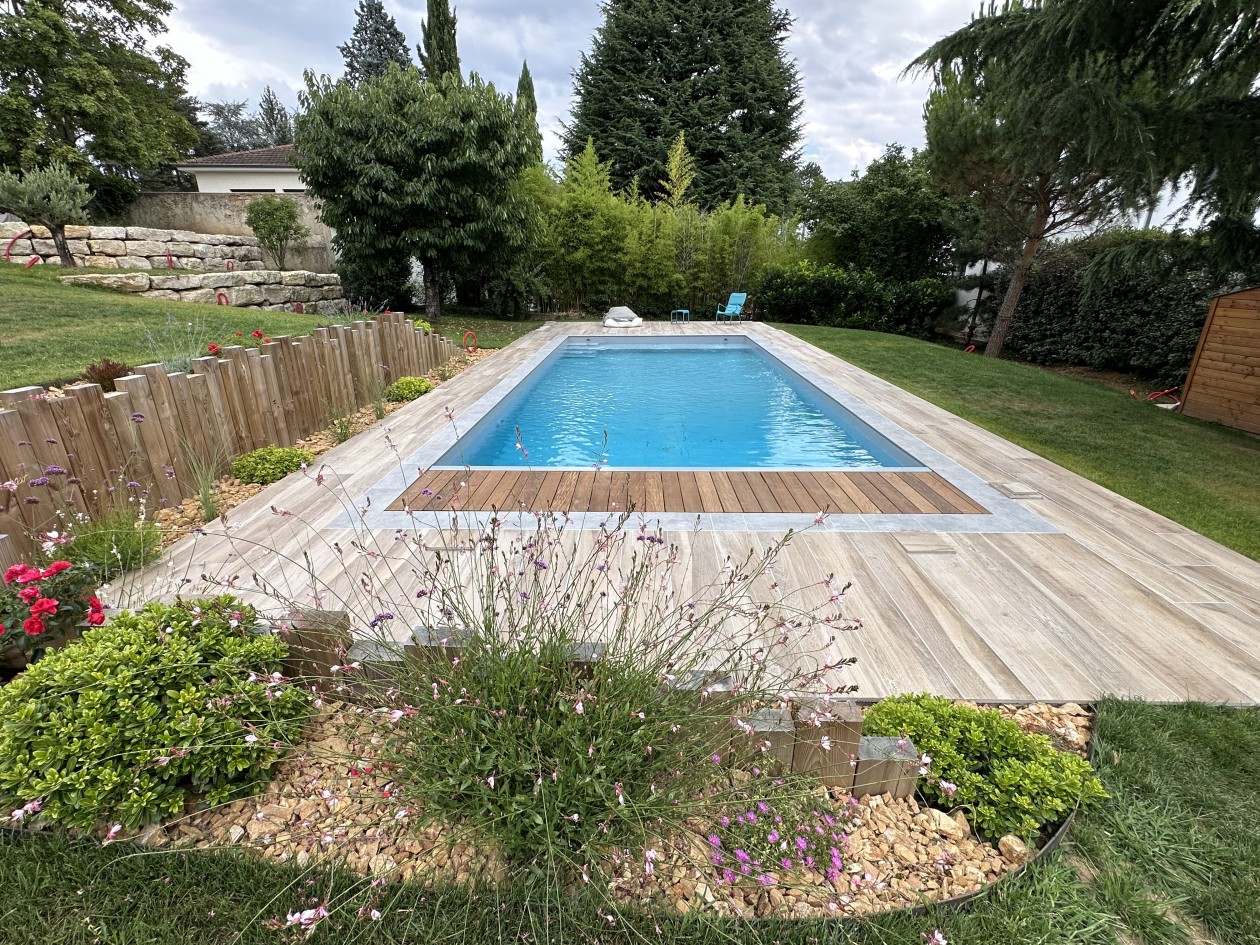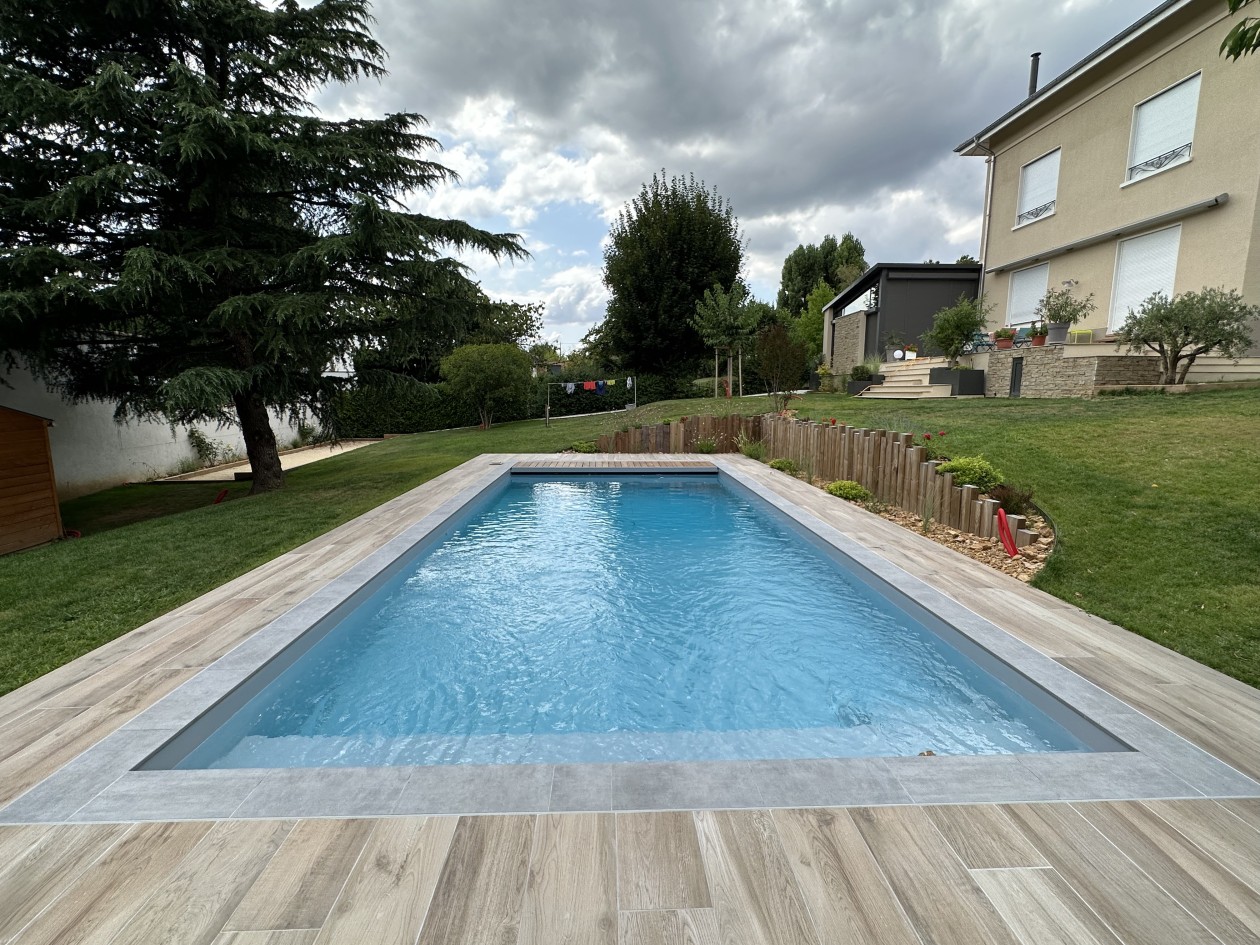 Piscine beton 10m x 5m PVC Armé, volet roulant, carrelage Atlas Concorde aspect bois.