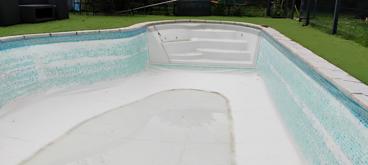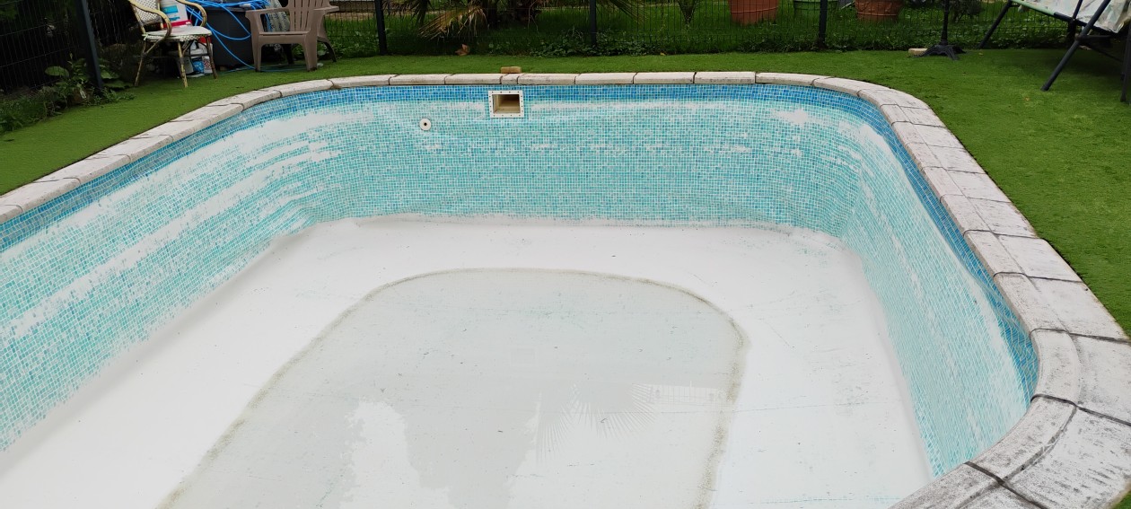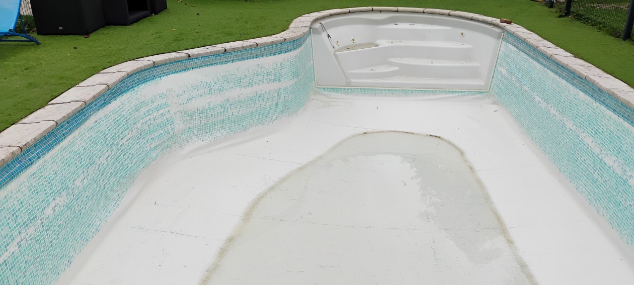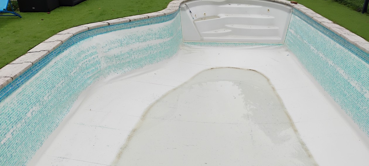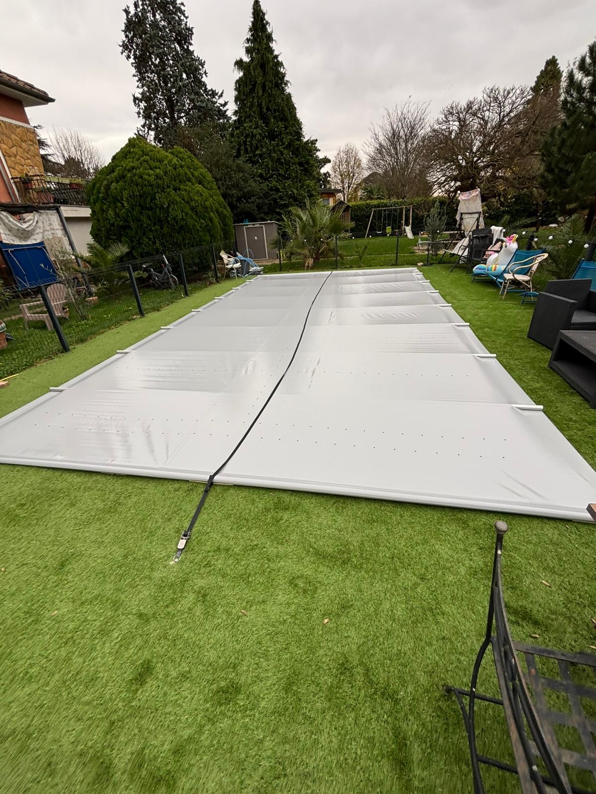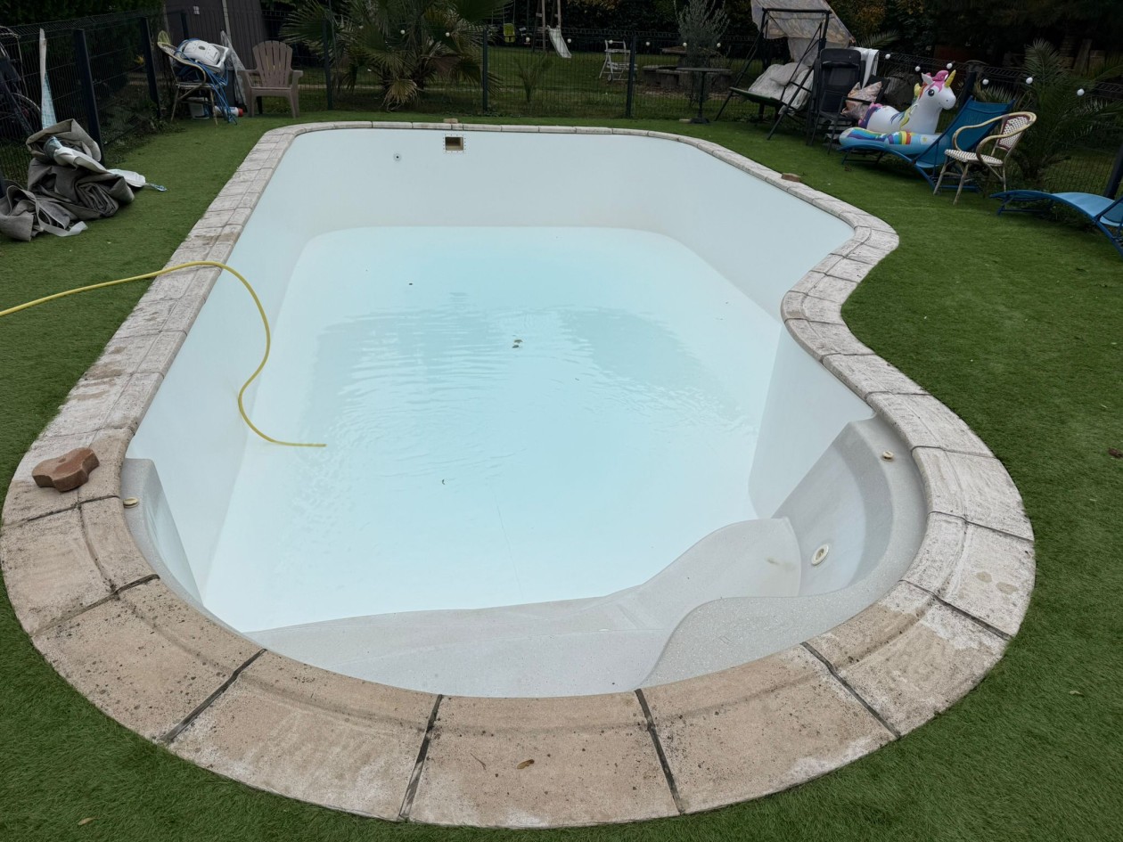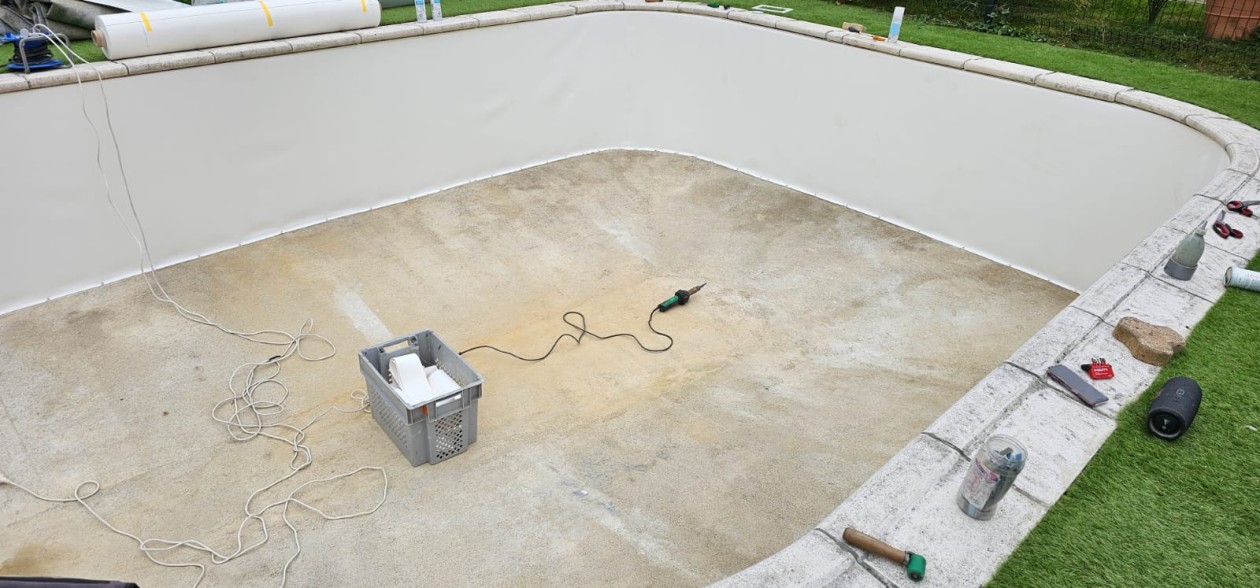 Changement d’un liner par un PVC Armé sur une piscine en forme et en tôle. Pose d’une couverture de sécurité.